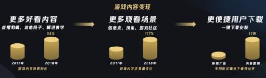 還有是游戲內容變現,2018年受政策的影響,我們看到一個趨勢,用戶且不說玩不玩游戲,對于游戲內容的消費在2018年是有非常快速增長的,不管從用戶消費游戲內容的時長,還是消費頻率,在2018年都有很快的提高,而且我們發現一個趨勢,看過游戲內容之后下載游戲的轉化率是明顯高過于基于傳統應用商店和傳統廠商廣告下載,所以游戲內容在圖文和短視頻領域的消費占比是非常快速的提升,已經算是我們第一大消費平臺了。未來我們相信用戶下載游戲的場景,絕對不會只是單一的去應用商店或者廠商商店,我們相信通過游戲內容帶來游戲的下載,會成為一個行業趨勢。游戲的下載意味著游戲強大的變現模式,可以解決游戲品類創作者變現的問題。