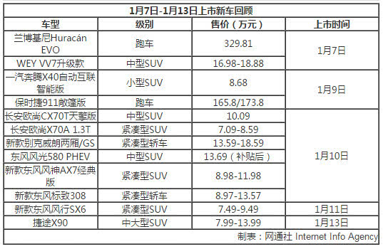 進入新的一年,各大汽車廠商加快了投放新車的速度,以便有個好開局。網通社經過梳理發現,上周(1月7日-1月13日)共有12款新車上市,其中,新車售價最低的,僅需7.09萬元;而售價最高的可以達到329.81萬元。以下的新車中有沒有你的菜呢?