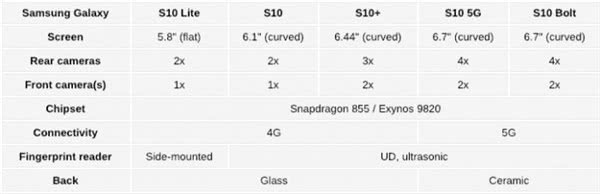 至于定位上,Galaxy S10 Lite是入門的,最高端的是Galaxy S10 Bolt,除了屏幕尺寸不同外,這些新機在前、后攝像頭、指紋識別上也不相同,具體來說如下: