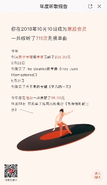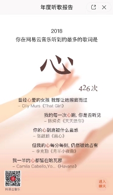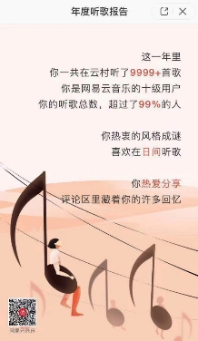 2019年1月4日,網(wǎng)易云音樂(lè)推出2018年度聽歌報(bào)告,通過(guò)回顧過(guò)去一年聽歌“足跡”展現(xiàn)音樂(lè)對(duì)每個(gè)人生活的陪伴,一上線就已經(jīng)刷屏朋友圈。