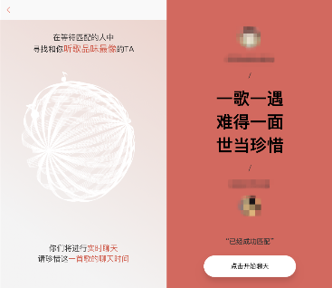 值得一提的是,在聽歌報(bào)告的結(jié)尾,網(wǎng)易云音樂(lè)還特別設(shè)置了“一歌一遇”的用戶匹配的“彩蛋”。當(dāng)瀏覽完報(bào)告后,用戶將進(jìn)入“一歌一遇”環(huán)節(jié),系統(tǒng)會(huì)自動(dòng)為你推薦一位當(dāng)前在線、且聽歌口味相近的用戶。進(jìn)入聊天窗口后,將自動(dòng)播放雙方共同的紅心歌曲作為背景音樂(lè),雙方可以隨意聊天、點(diǎn)歌,也可以選擇預(yù)設(shè)的問(wèn)題考驗(yàn)?zāi)醵?。?jù)介紹,在雙方同時(shí)在線情況下,紅心歌單是此次用戶匹配機(jī)制的主要依據(jù),相同紅心歌曲數(shù)量越多越容易被匹配。退出對(duì)話后,還可再次匹配新的用戶。