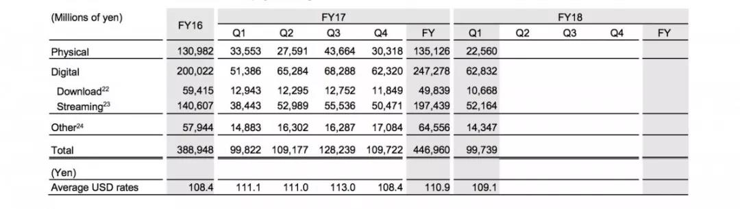 從財(cái)報(bào)數(shù)據(jù)來看,在2016年,索尼音樂的流媒體收入就已經(jīng)超過了實(shí)體收入。而在2017年,二者差異更加明顯。2017年實(shí)體收入僅上漲了4億日元,而流媒體收入上漲了57億日元,漲幅高達(dá)40.4%。而2018年第一季度的數(shù)據(jù)顯示,實(shí)體收入相較于2017年第一季度下滑了33.6%,流媒體反而比2017年同期增長(zhǎng)了43.1%。