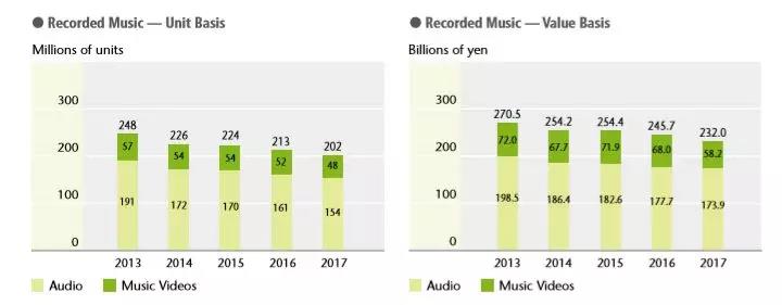 IFPI《2018全球音樂報(bào)告》顯示,在2017年,日本實(shí)體唱片的市場(chǎng)份額高達(dá)72%,是世界上實(shí)體唱片市場(chǎng)份額最高的國(guó)家。根據(jù)外媒MBW對(duì)日本唱片協(xié)會(huì)(Recording Industry Association of Japan)統(tǒng)計(jì)數(shù)據(jù)的分析,日本流媒體市場(chǎng)在2018年的前九個(gè)月與去年同期相比增長(zhǎng)了29%收入超過225.9億日元(約2億美元)。而同期CD的市場(chǎng)份額為1145.6億日元(10億美元),是前者的五倍之多。