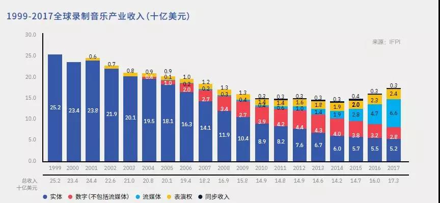 從全球角度來看,流媒體已經(jīng)勢(shì)不可擋,成為了產(chǎn)業(yè)增長(zhǎng)的主要驅(qū)動(dòng)因素。據(jù)IFPI數(shù)據(jù)顯示,從2013年的14億美元上漲到2017年的66億美元——五年之間,翻了五倍之多。