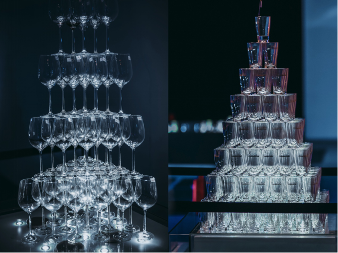 郭強用蒙太奇手法將高腳杯、香檳杯組成的“香檳塔”與紅酒、白酒等元素“剪輯”在一起的藝術裝置《無題》,制造出一種概念與時空交錯的感覺,能夠給你帶來視覺、嗅覺和味覺等感官不同的感受和體驗。作品中的WMF德國福騰寶咖啡杯,使用水晶玻璃材質,耐熱抗造,整個杯身晶瑩剔透,通透光潔;青蘋果水晶玻璃紅酒杯,線型流暢,高挑輕盈,天生為品味而生。
