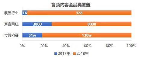 從喜馬拉雅“123狂歡節(jié)”公布的一組數(shù)據(jù)來看,喜馬拉雅從去年的16個(gè)行業(yè)擴(kuò)展到了328細(xì)分行業(yè),付費(fèi)內(nèi)容從31萬條上漲到了138萬條,“聲音網(wǎng)紅”的數(shù)量則從3000位增長到了8000位。