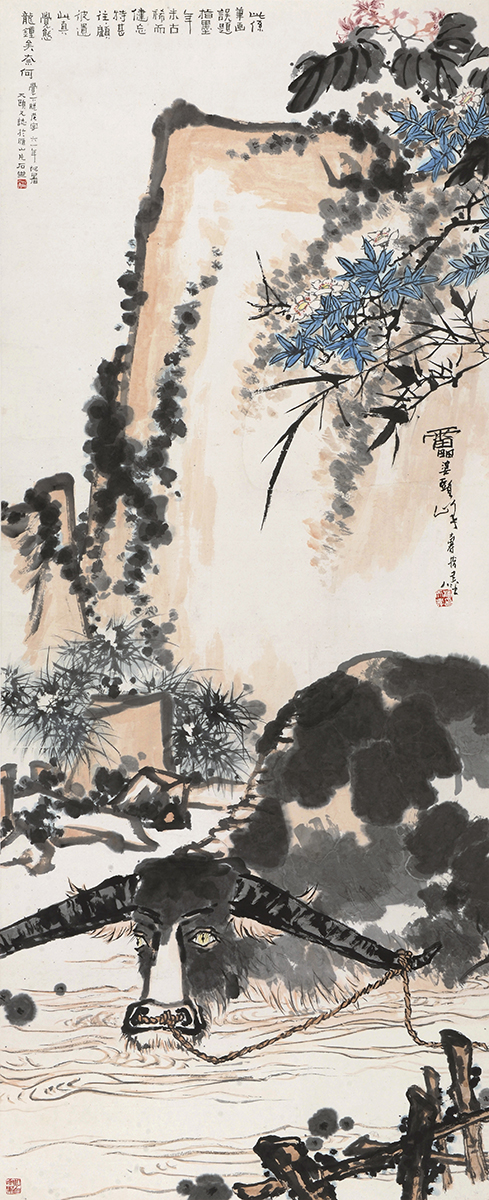 據目前所知,潘天壽存世的畫牛作品一共是四件:一件是《夏塘水牛圖》,現藏潘天壽紀念館;一件《耕罷》,現藏潘天壽老家浙江寧海市文物管理委員會;另一件同名作品《耕罷》曾于2017年春拍現身拍賣市場,并以一億五千多萬的高價成交;再一件就是此幅《春塘水暖圖》。四幅作品,兩幅橫構圖,兩幅豎構圖,都是水墨設色,其中的牛大致相同,但并不重復。橫構圖的牛在水中裸露大半個身軀,占去了畫面的一半,畫幅橫展,水墨淋漓;而這幅《春塘水暖圖》以豎幅構圖將牛推向近前,從而留出空間,讓巨大的“潘公石”營造背景,是獨特的潘氏構圖。