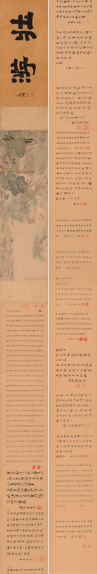 明代吳門繪畫是中國繪畫史上璀璨奪目的篇章,文征明作為吳門畫派的盟主,其詩文、書畫藝術水準無疑是那個時代的標桿。本場我們爭取到過云樓顧文彬舊藏文征明《溪堂?別圖》卷,是一件令人矚目的作品。本卷是文征明為其弟子,也是毛珵之子毛錫嘏北上北京,雅集之后所作“送別圖”。毛錫嘏于嘉靖辛丑(公元1541年)夏貢入太學,臨行吳門畫派眾人文征明、陸粲、“皇甫四杰”兄弟、周天球、王榖祥、文彭、文嘉、文伯仁、彭年、陸師道等吳門中堅16人酬唱作別,文征明作此圖,周天球作序記述因果,眾人作詩題跋。“送別雅集”相對于其他形式的雅集來說,是一種更具有儀式感的聚會形式。“雅集”之后見諸于圖文,是為“送別圖”,它在這個儀式感比較強的“雅集”中就成為了一種歷史的憑證,是類似于典禮中的終極圣物,所以文征明贈毛錫嘏《溪堂?別圖》卷是吳門盛宴之后的見證,是吳門畫派極具研究價值的畫作。此卷《溪堂?集圖》先后為明代朱之赤,清代查瑩,顧文彬、顧麟士祖孫先后遞藏,更顯得彌足珍貴。