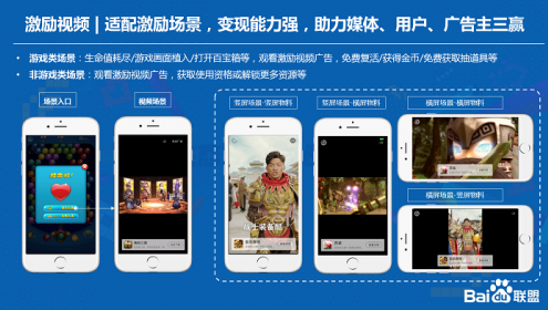 百度聯盟的廣告產品,通過數據賦能“廣告+內容”雙引擎,為聯盟伙伴提供全方位解決方案。廣告變現層面主打APP端,在百度AI營銷助力下打造移動新生態,重點發力短視頻APP流量變現。剛推出不久的激勵視頻可深度融合場景,由用戶主動選擇觀看廣告,從而“換取”更多應用權限或游戲獎勵,從而形成用戶得到增值服務、伙伴流量變現、廣告主獲得更多轉化的三贏局面。此外,百度聯盟還為與伙伴共建內容生態,提供了多種定制方案,實現廣告與內容的高效融合,促進新用戶轉化。數據賦能方面,通過多維度透視流量價值,提升流量變現效率。、