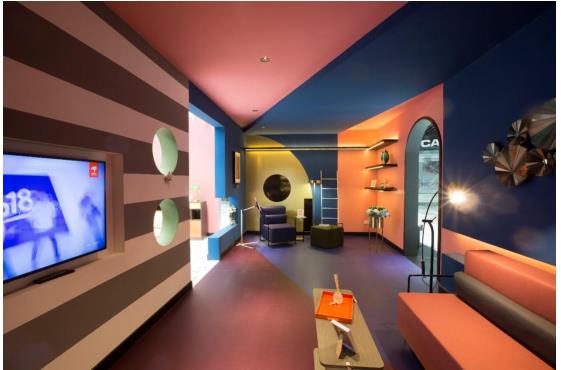 此次,“Apartment Store”與京東17大居家生活品牌相結合,將國際流行的臟彩色通過色塊、線條及曲面做到拼接融合,視覺沖擊強烈,再現了孟菲斯時期的意式色彩狂想,而幾何模塊化里面還有蒙德里安的影子。大膽跳躍的色彩和形狀組合,讓“家”幻變成一個多面精靈。客廳采用大膽濃烈的墻體顏色搭配鬼馬集合造型,濃濃的意式配色風格,讓人在放松之時感受異國情調。而暖透身心的燈光,則讓人卸下疲憊,沉浸其中。臥室自帶催眠魔力的法式雅致色調,配合異型臺燈,與木色和深藍色碰撞出的夏季清涼,編織出一場夢幻旅程。廚房則沿用了大受好評的水磨石地面,淡雅的色彩充滿童心。