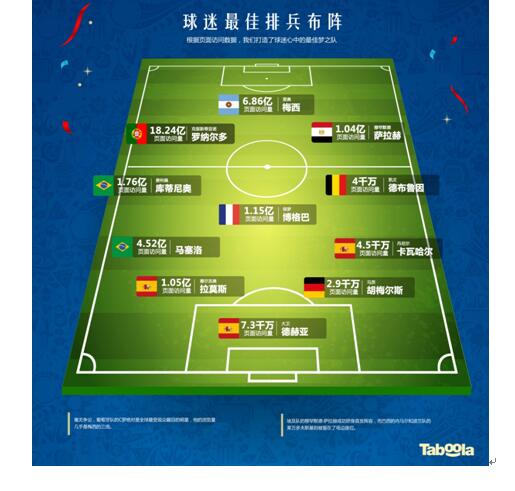 更有趣的是,Taboola調查了全球范圍內足球運動員的“人氣值”,相關內容點擊率越高的球員代表了越多球迷的喜愛和支持,并根據訪問數據制定了一份球迷心中的最佳排兵布陣圖。其中C羅以18.24億的驚人數據成為所有球員中當之無愧的明星,其巨大的影響力和號召力受到全球球迷矚目。