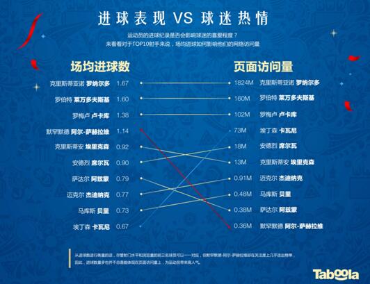 然而,球迷的支持就一定意味著運動員在綠茵場上的神勇表現嗎?調查結果認為不一定。Taboola通過對球員頁面訪問數據和場均進球數據進行對比發現,盡管射門水平和瀏覽量較高的前三名球員可以一一對應,然而在諸如默罕默德-阿爾-薩赫拉維等選手等身上,優秀的球場表現并不能為其帶來較高人氣。而球迷對于埃丁森·卡瓦尼的關注和支持,也無法保證他為球隊貢獻足夠多的進球。