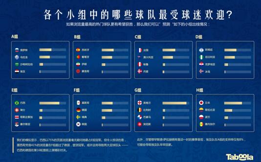 每屆世界杯都會有由球迷票選出的“奪冠熱門”。今年,Taboola對8個小組中的球迷支持率進行調查,結果顯示英格蘭隊和巴西隊以極高的網絡瀏覽量毫無疑問地登頂各自小組的冠軍,其他小組的熱門球隊分別有西班牙、法國、阿根廷、日本等。