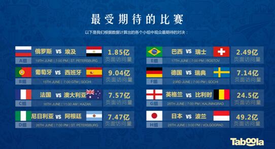 此外,Taboola也通過頁面瀏覽數據發現了本屆世界杯各個小組賽中最受球迷期待的比賽。其中,日本對波蘭、英格蘭對比利時、葡萄牙對西班牙、法國對澳大利亞等都將是最受球迷關注的焦點之戰。動輒數十億的頁面訪問數據將是商家借機進行數字營銷的絕佳機會。品牌營銷人員可以對照以下比賽時間表及時制定最佳營銷策略,迎峰而上。