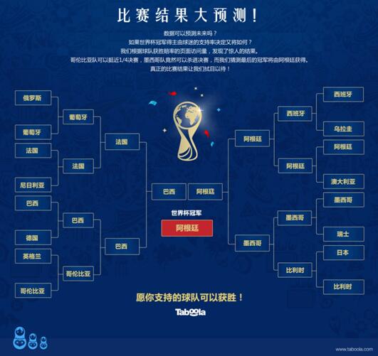 對于本屆世界杯的最后贏家,Taboola也基于其對大量數據的嚴謹研究,給出了大膽的預測。兩大熱門球隊巴西隊和阿根廷隊將在決賽中相遇,并最終由阿根廷人摘得桂冠。當然,每一位球迷最大的心愿就是自己支持的球隊可以在世界杯中取得佳績。而中國擁有龐大球迷基礎和最高支持率的阿根廷隊最終能否如愿在俄羅斯捧起大力神杯?讓我們拭目以待!