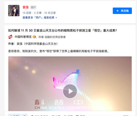 活動現場嘉賓黎耕、袁強等人,除了是天文研究員的身份以外,他們同時也作為知乎用戶在站內分享著自己專業的知識、經驗、見解。作為2017年國內乃至世界最受關注的天文界事件,《自然》雜志 11 月 29 日發表我國暗物質粒子衛星“悟空”的首個科學成果,宣布獲得了世界上最精確的高能電子宇宙線能譜。在知乎上,該事件同樣受到大量用戶的關注與討論,站內機構號“中國科普博覽”更是發起免費Live解讀“悟空”暗物質粒子的新發現——“如何解讀 11 月 30 日紫金山天文臺公布的暗物質粒子探測衛星「悟空」重大成果?”中國科學院紫金山天文臺研究院袁強就參與了討論回答,引來網友點贊。