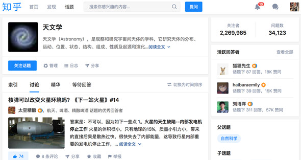 事實上,在知乎站內“天文學”相關話題累計有超過220萬的關注用戶,問題數高達34123條,可以說知友對于宇宙星空的探索討論從未停止。同時,截止到2018年5月,知乎注冊用戶達到1.6億,每天有數以千萬計的用戶在這里提出問題、發布回答、瀏覽話題。