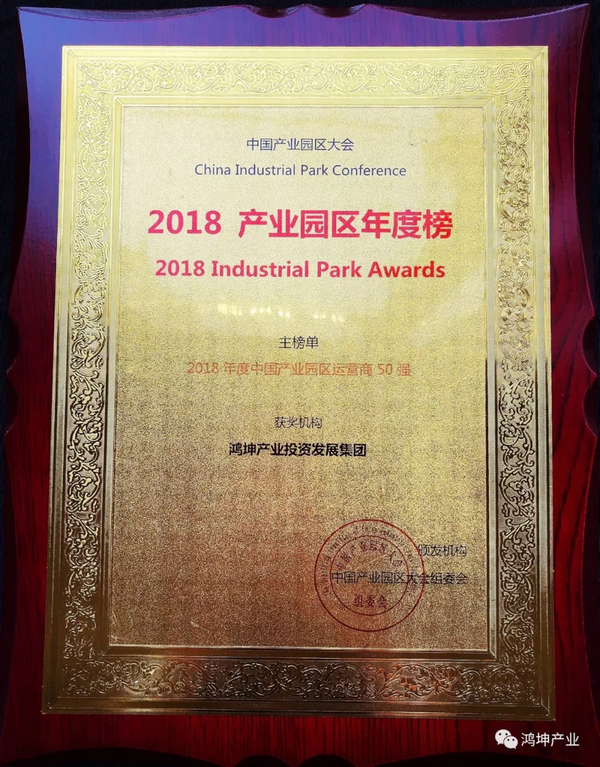 鴻坤產業獲得2018年度中國產業園區運營商Top50