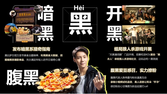 2017年10月,美團點評與必勝客共同攜手,借勢萬圣節熱點,圍繞著“黑”進行了腦洞大開的創意發散。從產品視覺、明星形象、社交游戲三個維度進行全方位的傳播互動,并且充分調用了美團點評平臺的美食大數據優勢,將“黑”從一種單一的視覺顏色變成一種風格、性格與生活方式。最終,黑出彩才夠WOW,必勝客萬圣節新品‘黑’營銷”案例由此而生,深受95后年輕消費者熱捧,并榮獲跨媒體整合營銷銀獎。