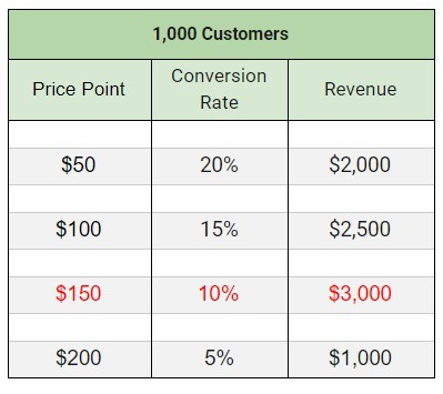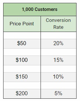 經過測試,你會發現以下選項3(10%轉化率)是基本產品價格,適合市場、客戶、利潤和覆蓋成本。