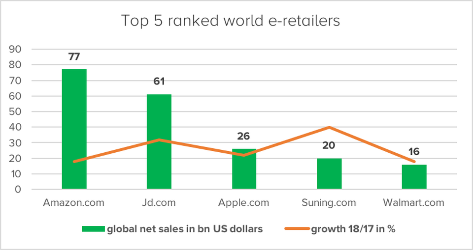 2018年,前五大網上商店的全球凈銷售額超過2000億美元。在2018年按網上銷售排名的前五大世界電子零售商中,有三家來自美國,兩家來自中國。2018年的最大增長來自中國的蘇寧和Jd(EcommerceDB)。蘋果還注意到2018年與2017年相比增長了22%。中國電子零售商2018年的增長率顯著高于美國。根據eMarketer最新的全球零售和電子商務預測,中國有望在2019年成為世界頂級零售市場,超過美國超過1000億美元。電子商務超過中國零售額的35%,是世界上最高的(eMarketer)。