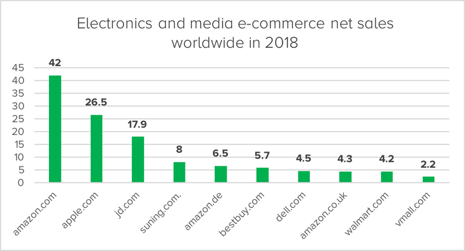 2018年,亞馬遜市場領導者通過銷售全球電子和媒體類別的實物商品,創造了420億美元。另一方面,蘋果排名第二,營收為266億美元。