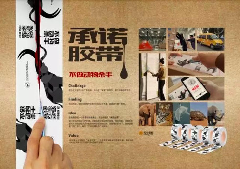 為了承擔起更多的社會責任,為動物保護公益出一份力量。鳳凰網(wǎng)攜手生米組成、蘇寧易購設計產(chǎn)出了“承諾膠帶”。項目創(chuàng)新利用了全新的媒介形式和互動方式,以消費者一定會接觸到的快遞包裝箱為接觸點,利用特殊的夾層工藝膠帶為互動介質(zhì)、以多種遭盜獵的動物圖形為溝通內(nèi)容,通過蘇寧易購龐大的物流網(wǎng)絡,將保護動物的倡議傳達給全國各地,倡導更多消費者對野生動物制品說“不”。