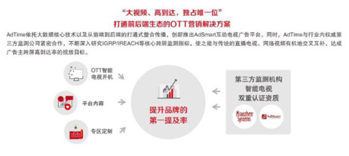 ??所謂“大視頻、高到達”OTT智能電視營銷解決方案,核心思想在于廣告資源打通,實現雙管齊下、有效互補,達成高效互動營銷。除了本身所掌握OTT智能電視開機、點播平臺內容、專區定制三大廣告資源并有能力加以整合,并強調差異化發展策略。除了開機廣告、前貼片、屏保或品牌專區等基礎廣告投放形式外,AdTime更強調整合營銷策略的定義和引導:例如品牌的露出方式上軟性植入,以及后續應該選擇什么媒介;如何利用PC和移動端,多端打通,讓廣告價值得到多維延展,等等。