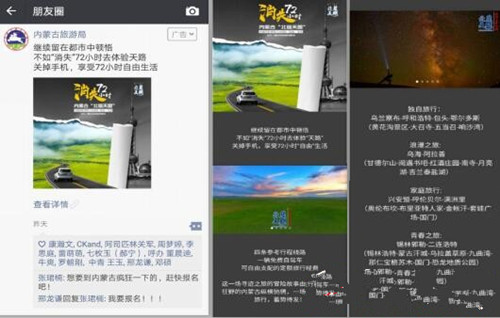 ??“北疆天路”是內蒙古自治區旅游發展委員會于2016年推出的內蒙古夏季自駕游線路品牌,2016年的受斯巴魯(中國)贊助,邀請眾多媒體參與由東至西歷時一個月的采風體驗。而今年“北疆天路”除了與斯巴魯繼續戰略合作以外,將主戰場由線下轉向線上,積極與搜狐、知乎、騰訊等大型平臺合作:知乎KOL發布“如果你可以消失72小時,你要去做什么?”問答,發布優質軟文;聯合搜狐獨家策劃消失72小時專題頁面,打造消失通道同時支持PC端、手機端報名參加體驗。總曝光量為4,681,605人次,點擊報名鏈接12,170人次,策劃于騰訊微信朋友圈投放內蒙古北疆天路“消失72小時”活動招募廣告,在北京、上海、廣州、哈爾濱、西安、沈陽、杭州、合肥、天津、重慶等全國十大核心城市,目標年齡群指向22-45歲。當日曝光量為322,967人次,點擊報名鏈接1,275人次。