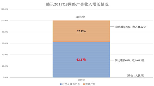 11月15日,騰訊公布2017年第三季度財報業績。截止2017年11月15日,騰訊第三季實現營業收入652.1億元,同比增長61%。其中,網絡廣告業務2017年第三季的收入同比增長48%至人民幣110.42億元。