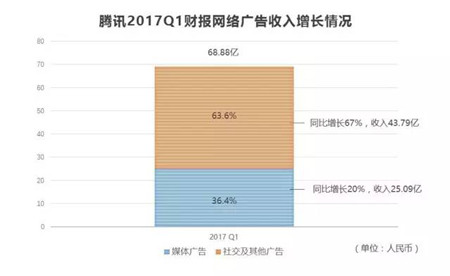 5月17日,騰訊公布2017年第一季度綜合業(yè)績(jī)。截止2017年3月31日,騰訊首季總收入為495.52億元,同比增長(zhǎng)55%。其中,網(wǎng)絡(luò)廣告業(yè)務(wù)的收入同比增長(zhǎng)47%至2017年第一季的人民幣68.88億元,主要受到 “社交及其他廣告收入” 帶動(dòng)。