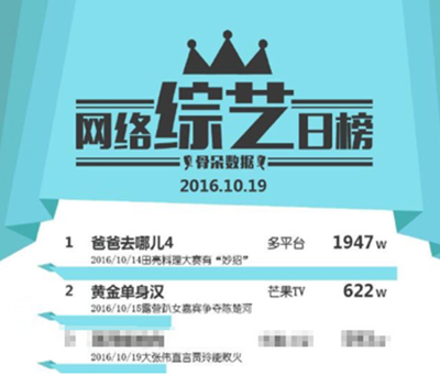 又破了,又破了! 《爸爸去哪兒4》網綜一開播就打破網絡點播記錄,先導片加一期正片兩期點播迅速破3.5億(芒果TV2.5億、優土1億),連日來承包骨朵數據、Vlinkage、藝恩等網綜播放榜第一,領跑網綜不是一點點,“霸屏”效應亮瞎了所有人的眼球。