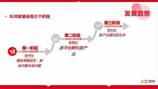 3、 新生態(tài)階段:新產(chǎn)業(yè)催生新生態(tài),行業(yè)高度兼并整合,B2B成為更加底層的基礎(chǔ)設(shè)施,進(jìn)而實(shí)現(xiàn)對(duì)全產(chǎn)業(yè)鏈的賦能;