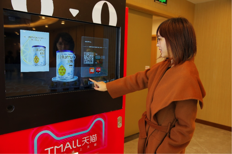 年輕媽媽體驗天貓智能母嬰室外的自動派樣機