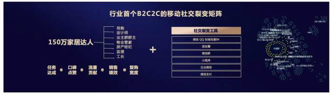 以達人觸點矩陣為例,紅星美凱龍擁有由導購、設計師、房產經紀、業主群群主、家居達人、異業伙伴組成的150萬家居達人天團。在家居行業,手握精準流量的各路達人就是超級媒體。在騰訊提供的微信、QQ、朋友圈、小程序等社交裂變工具賦能下,IMP平臺將喚醒這150萬個沉睡的火山,打造行業首個B2C2C的移動社交裂變矩陣。