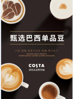 3月起,對于喜歡意式咖啡的消費者,在經典摩卡意大利拼配豆的基礎上,COSTA推出了全新甄選巴西單品咖啡豆,此款100%單一產地的阿拉比卡咖啡豆來自巴西塞拉多地區,使用日曬法處理生豆,為咖啡帶來更為甘甜平衡的香氣,使整體口感香醇順滑,并伴隨著迷人的焦糖和黑巧克力風味。對于消費者來說,無論是喜歡牛奶比例更高的拿鐵,還是忠實的美式粉絲,都可以在自己喜歡的咖啡中選擇此款單品豆,感受更加講究的單品豆帶來的風味變化。