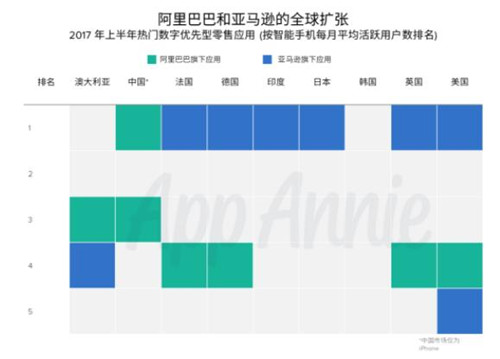 ??2017 年上半年,阿里巴巴數(shù)字優(yōu)先型應用的智能手機平均每月活躍用戶數(shù)在所分析的 9 個國家的 5 個國家中打入了前五,其中在中國有兩款,分別為淘寶 (位居第一) 和天貓 (位居第三),相比 2016 年上半年又多了一個國家 (2016 年上半年,阿里巴巴未出現(xiàn)在美國的前五名榜單中)。阿里巴巴旗下的全球速賣通 (AliExpress) 作為其面向西方市場的一家數(shù)字優(yōu)先型零售商,2017 年僅僅上半年時間就實現(xiàn)了驚人增長。與去年同期相比,全球速賣通 (AliExpress) 2017 年上半年的下載量增長了 80%,在全球的 iOS 和 Google Play 中下載量超過了 5000 萬。阿里巴巴對西方市場的開拓取得了巨大的成功:全球速賣通 (AliExpress) 穩(wěn)居澳大利亞、法國、德國、英國和美國智能手機應用每月活躍用戶數(shù)前五名。