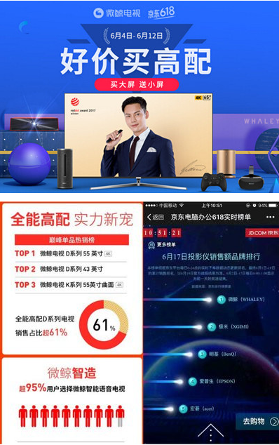 以“跨界”的方式,微鯨與百威、可口可樂等公司在一起,同時也與千萬個年輕家庭在一起,共享歡樂時光。在與百威、雪碧等跨界合作的基礎上,“最懂年輕人”的互聯網電視微鯨在618購物狂歡節順勢推出了“好價買高配,買大屏送小屏”活動。在京東網站公布的618品牌銷量排行榜中,微鯨智能投影F1斬獲投影品類銷冠,鯨智能語音電視D系列產品也領跑熱銷榜,再次成為銷量之王。