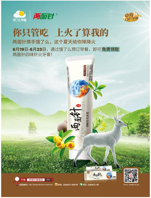 兩面針除了有天貓旗艦店,出品了多款符合年輕用戶的包裝,最近還與餓了么合作,創意出新的用戶溝通模式。“你只管吃,上了火算我的”活動,提升線上線下的使用體驗,創造更大的市場機會和用戶價值。跨界活動為傳統企業營銷轉型 、產業升級注入了新的活力,同時還將健康的理念進行了深層次的解讀。