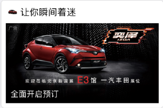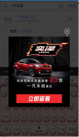 與此同時,一汽豐田奕澤IZOA還在線上打造了一場別出心裁的營銷活動。4月25日起,當用戶使用搜狗輸入法輸入“奕澤”、“豐田”、“車展”等關鍵詞時,一汽豐田奕澤IZOA的品牌廣告會實時呈現在用戶前面,為感興趣的用戶提供一鍵直達的快捷入口。