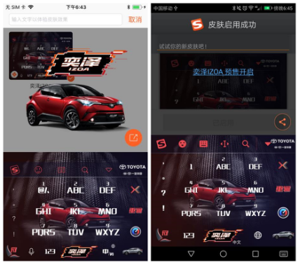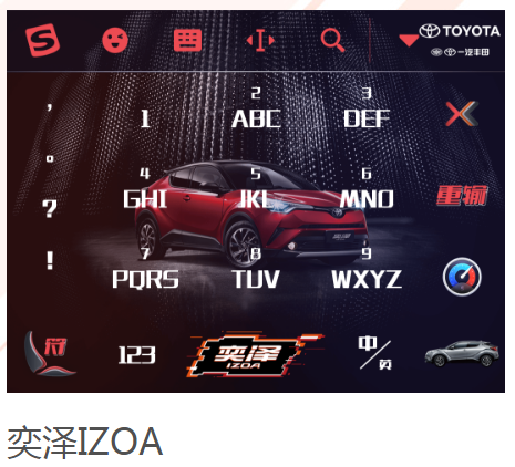 搜狗還為一汽豐田奕澤IZOA打造了專屬的輸入法皮膚,不僅在視覺上與一汽豐田奕澤IZOA進行了呼應,還提供了全鍵盤及九宮格兩種形式,細致、周全的貼合用戶使用習慣。同時,用戶點擊相應的功能鍵,還將有浮層的展現形式,進一步加深用戶的記憶度并更直接地關聯到品牌信息。