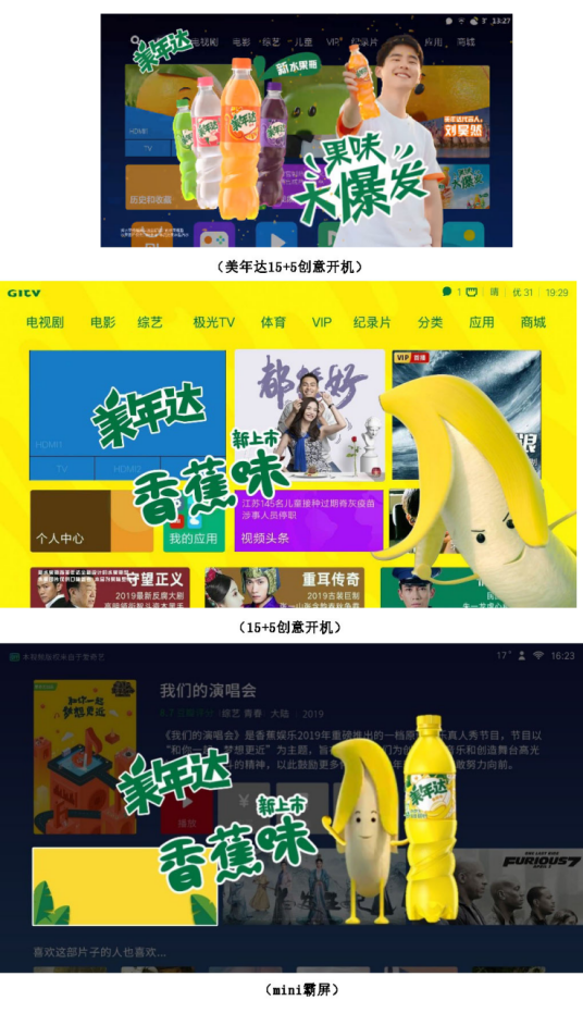 對于美年達來說,這部分用戶無疑正是其需要觸達的核心用戶。為此,美年達×小米在OTT端根據品牌傳播節奏,分別為美年達果味大爆發與香蕉味新上市,定制OTT創意15+5開機和mini霸屏,向消費者展示超強視覺體驗快速引爆新品上市的信息建立品牌強曝光,幫助品牌在大屏搶占消費者的關注。
