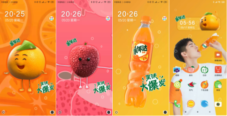 同時,在手機不離身的當下,手機端同樣是不容忽視的重要點位,不同于投放開屏廣告、Banner點位等傳統營銷方式品牌年輕化創新營銷的內核是賦予品牌以生命力,不是一味地生硬迎合最新的趨勢,而是通過將品牌、產品有機的結合,進行系統性的再造。此次美年達×小米合作創新的選擇了定制主題這種形式,巧妙地通過將解鎖與“果味大爆發”兩者概念做了巧妙的融合,不僅完美詮釋了美年達跟年輕人玩在一起的品牌理念,而且每一次解鎖都是一次“果味爆發”的直觀體驗。為了強化多果味、全新瓶型再到代言人劉昊然的品牌資產,此次合作中利用一套主題四種解鎖特效的形式進行展示,特別是劉昊然主題畫面,更是滿足了粉絲與愛豆親密接觸的心理,深受米粉好評。而用戶的每次開啟手機都是一次對于美年達品牌資產與產品特性的印象的加深,從而在潛移默化中占領用戶心智。