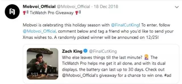 現在,Twitter旗下的ArtHouse部門還可以為中國出海品牌提供網紅營銷服務。近期的案例是中國品牌Mobvoi選擇與社交媒體上的科技達人兼視頻剪輯師ZachKing合作的一支幽默詼諧的視頻廣告,在Twitter上累計獲得200萬次曝光。