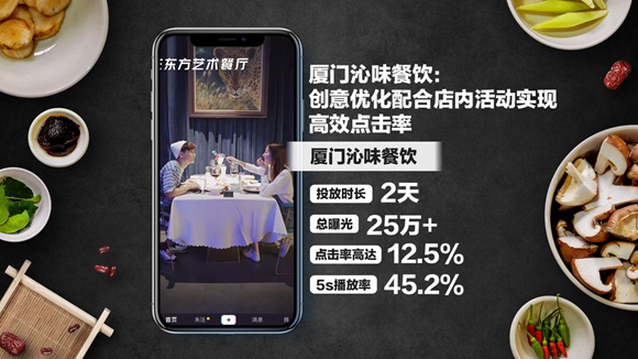 廈門沁味餐選擇投入品牌產品作為主要推廣對象,配合節日節點以及店內定期活動以增加曝光量。投放時常2天,總曝光25萬+,點擊率高達12.5%,5s播放率達到45.2%,這一成果同樣基于抖音TopView的精準定位推廣模式以及強勢的開屏霸屏短視頻,其推廣方式成功幫助企業在短時間內打開品牌知名度,也通過品牌對產品的投放和店內大量優惠活動等迅速帶來客流量。
