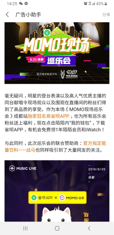 ??為了更好的宣傳戰馬品牌,在巡樂會成都站舉辦之前,陌陌就通過特別制作的巡樂會邀請函對戰馬進行充分展示,用戶在打開邀請函時,就會看到戰馬的品牌,不斷加深印象。同時,在巡樂會的直播開始之前,戰馬的貼片廣告也會多次播放,讓用戶對其有進一步進行了解。