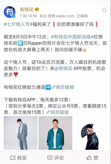 有錢花發起了幫助rapper登上機場大屏的粉絲互動活動。在有錢花中國新說唱紅榜上設置名單,邀請粉絲投票,助力前8名idol登上機場大屏,并有機會參加復活賽。
