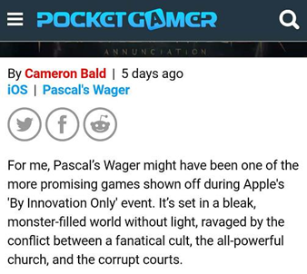 Pocket Gamer認為《帕斯卡契約》可能是蘋果發布會中最具前景的游戲