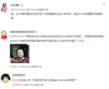有營銷專家還指出,數據之外的品牌增值也不可低估。通過蘋果官方“背書”,巨人網絡品牌影響力、美譽度在全球網民中迅速提升。在微博等社區中,有大量討論與巨人品牌增值有關。不少網友對于在發布會上看到巨人頗為“意外”、“沒想到”,巨人成為不少網友眼中“鵝廠豬廠要好好學”的游戲廠商。