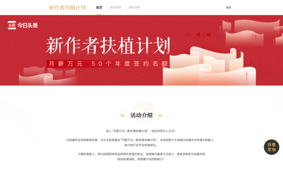 今日頭條宣布推出“月薪萬元 —— 新作者扶植計(jì)劃”。該活動(dòng)將通過征文的方式,評選出50位優(yōu)秀新人作者,并為他們提供簽約機(jī)會(huì)。這些簽約的獲獎(jiǎng)作者將獲得每月最高10000元,最低4000元的保底收入。
